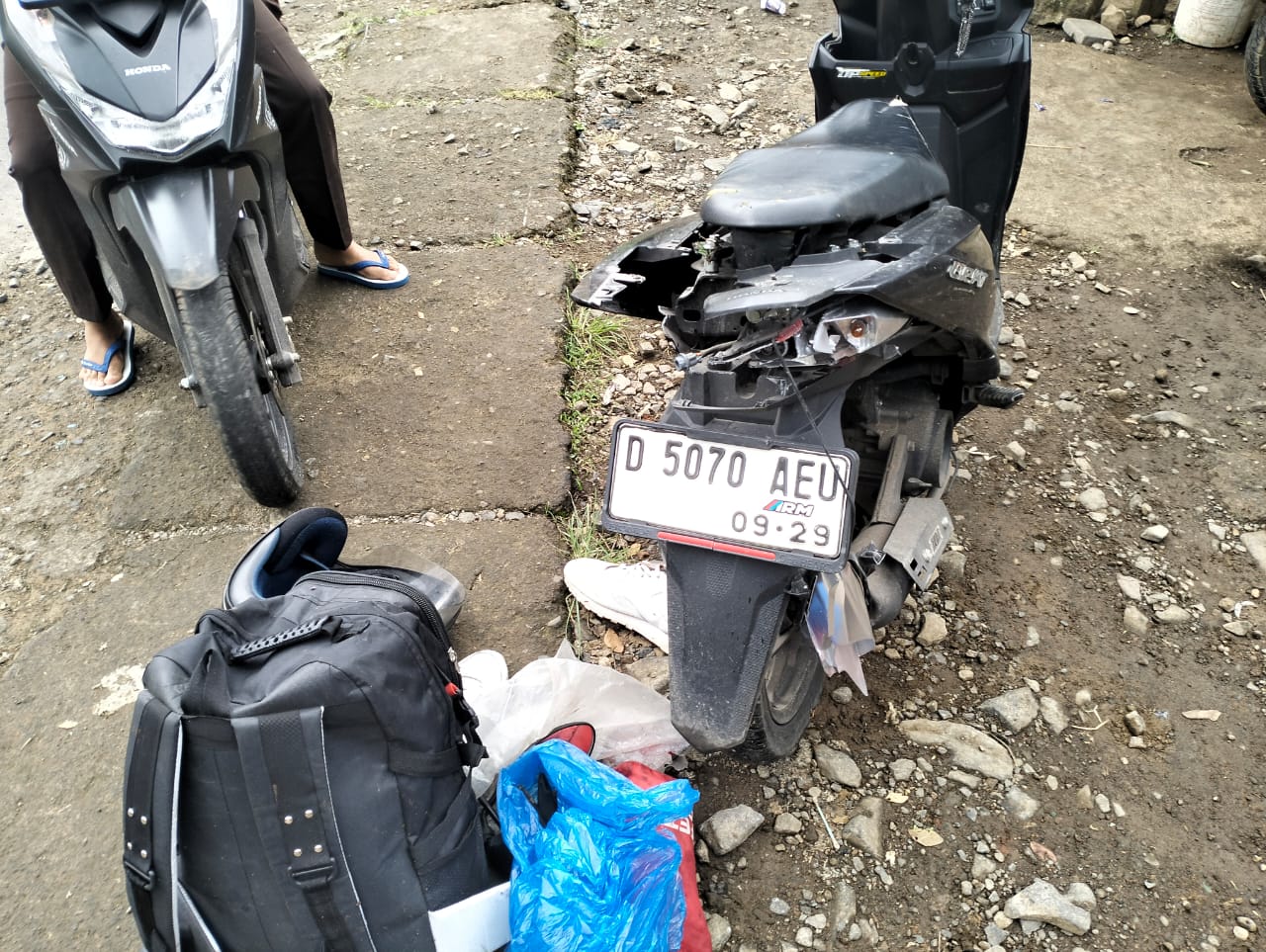 Akibat kejadian tersebut R2 jenis Honda Beat mengalami patah rek dan body motor akibat membentur dan tidak ada korban jiwa dalam insiden laka tunggal tersebut hanya mengalami memar, lecet di bagian tangan dan penumpang mengalami robek kulit di bagian Pipi sebelah kiri.