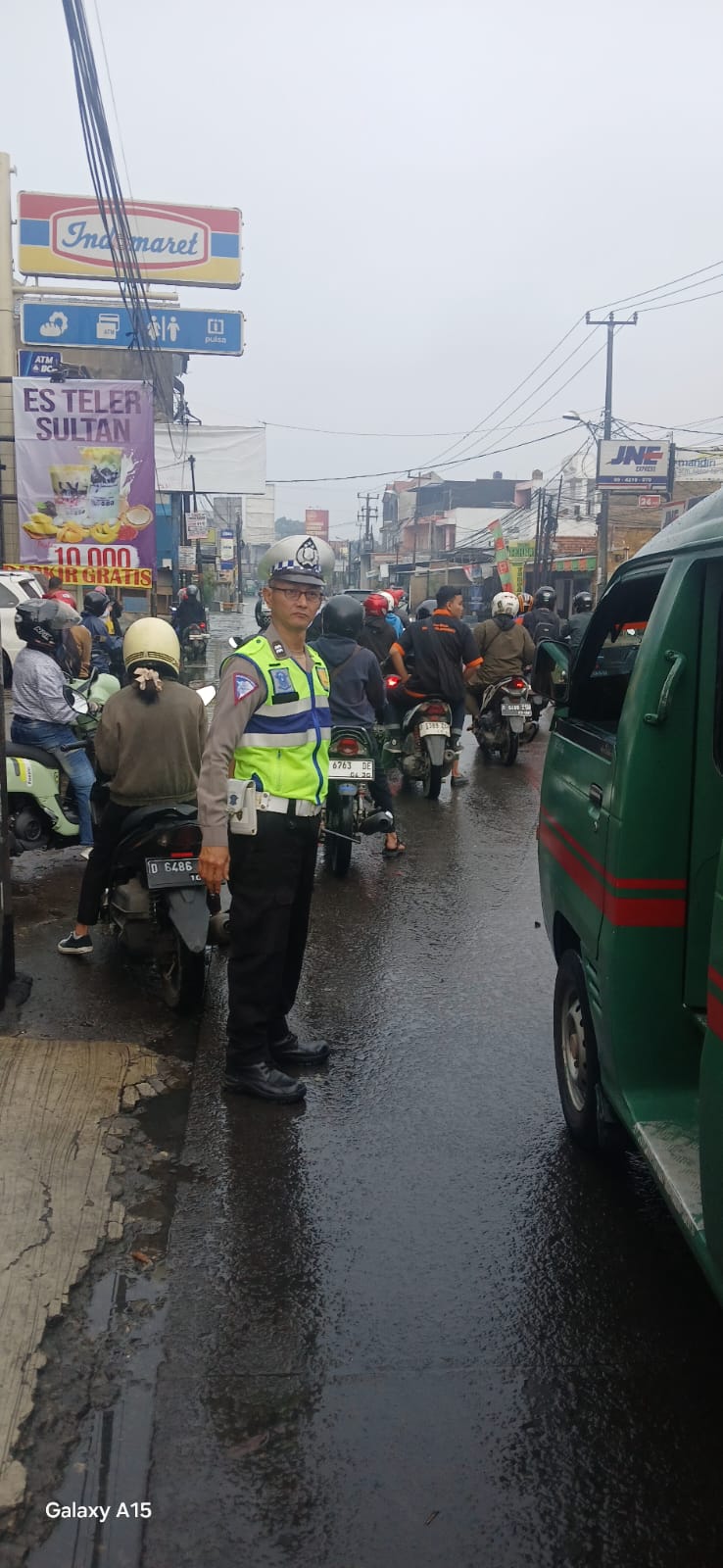 Genangan air setinggi lutut orang dewasa menyebabkan perlambatan kendaraan dari arah Sayati menuju Leuwipanjang. Tindakan cepat yang dilakukan Aiptu Deni bertujuan agar mobilitas warga tetap berjalan dengan aman dan tertib meski dalam kondisi cuaca kurang bersahabat.