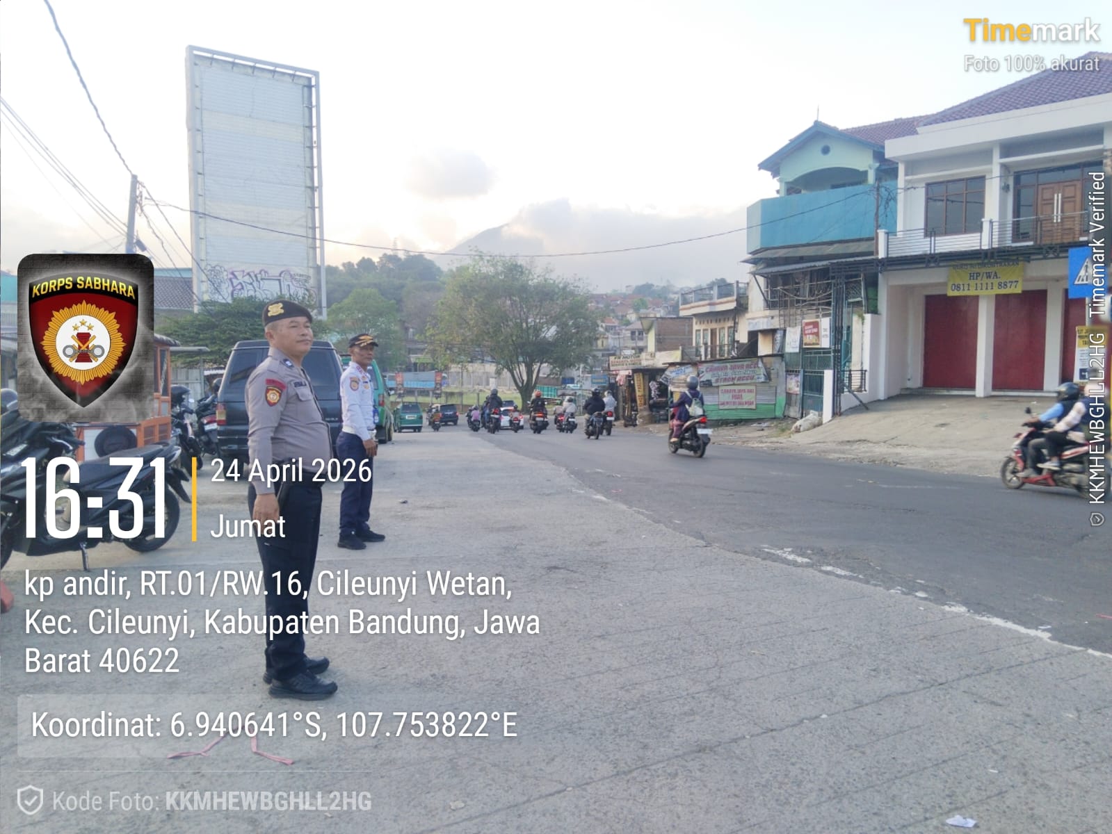 Personel Unit Samapta Polsek Cileunyi, Polresta Bandung, Aiptu Jenal Aripin melaksanakan kegiatan protap pengaturan lalu lintas (gatur lalin) sore hari di depan Pasar Sehat Cileunyi, Jl. Raya Cileunyi, Desa Cinunuk Kecamatan Cileunyi, Kabupaten Bandung. Jum’at (24/4/2026)