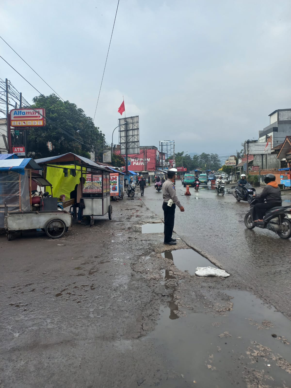 Usai hujan reda, petugas terlihat tetap berjaga di sejumlah titik rawan guna mengantisipasi aktivitas masyarakat di hari libur.
