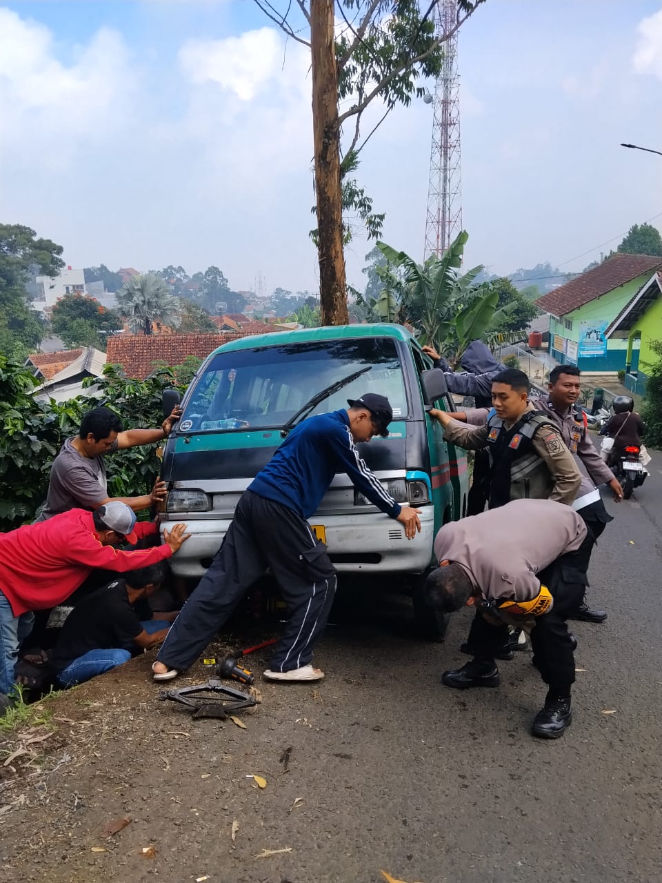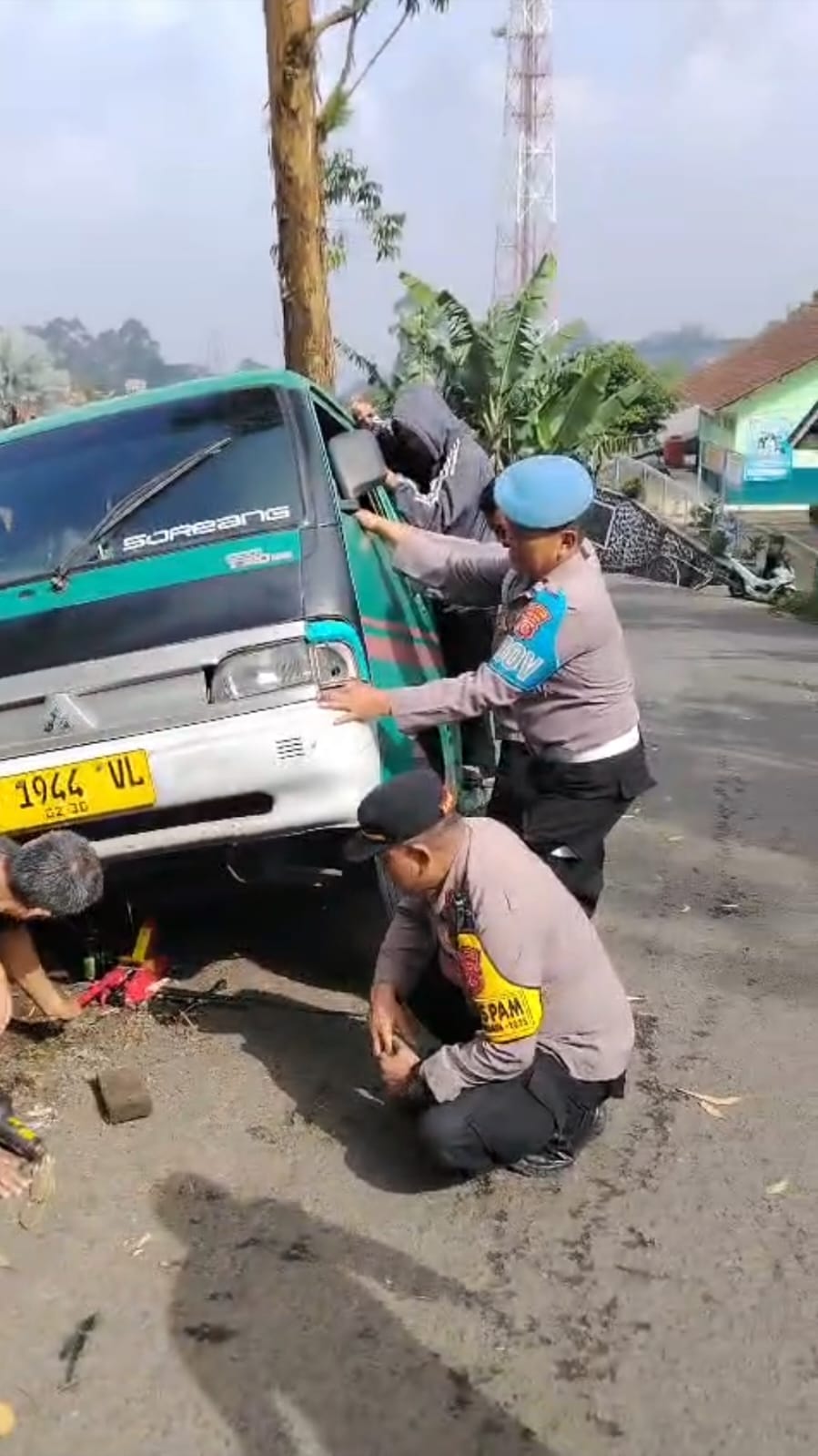 BANDUNGPRAKASA. COM. Polresta Bandung, // Anggota Pos Pengamanan (Pospam) Nataru 2025-2025 Cukang Monteng Ibun, membantu evakuasi angkot yang terperosok di jalan patrol Ibun akibat gk kuat nanjak di Wilayah cukang monteng, Kecamatan Ibun, Kabupaten Bandung.