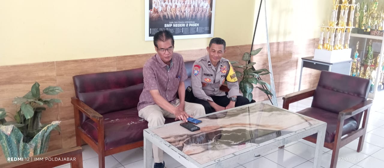 Bhabinkamtibmas Desa Drawati Polsek Paseh, Polresta Bandung Aipda Hamzah Sambangi SMPN 2 Paseh dalam rangka tetap terpeliharanya Kamtibmas yang aman dan kondusif di wilayahnya terus melakukan upaya seperti sambang warga binaan dan dialogis guna memberikan himbauan-himbauan Kamtibmas,