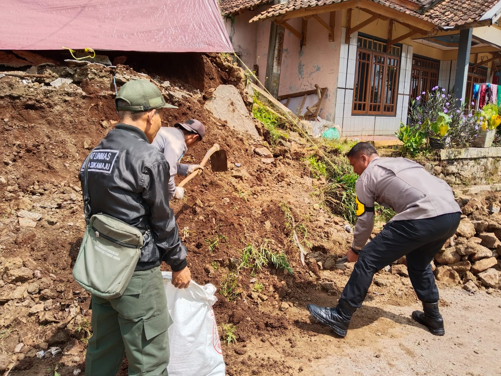 Bhabinkamtibmas Desa Sukamaju Cek Lokasi dan Gelar Gotong Royong Pasca Longsor Kecil di Kp. Madur Kidul