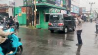 Meski Sudah di Guyur Hujan : Anggota Unit Samapta Polsek Solokanjeruk Polresta Bandung Gatur Lalin Sebagai Antisipasi Kemacetan
