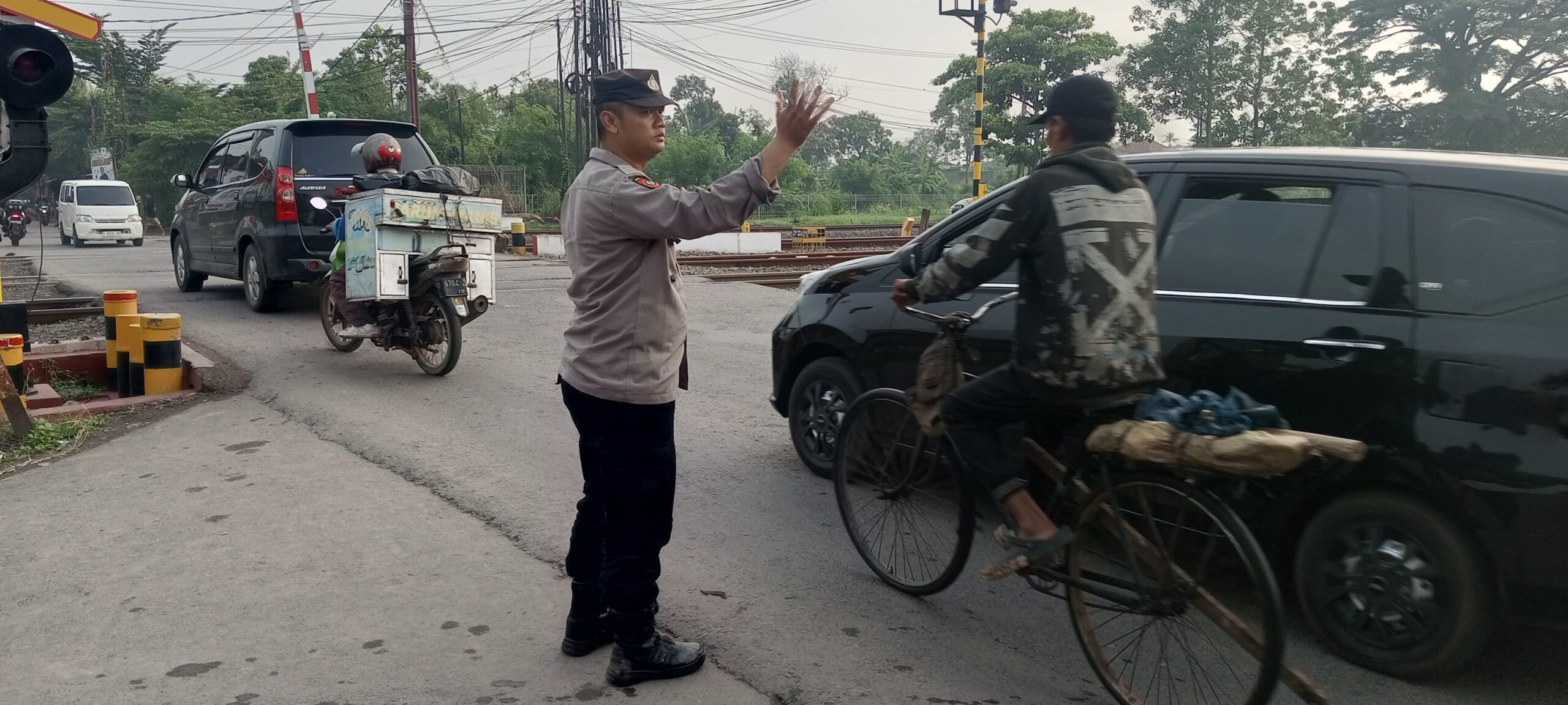 BANDUNG PRAKARSA, Rancaekek, Personil Unit Samapta Polsek Rancaekek Polresta Bandung pelayanan pagi urai kepadatan lalu lintas di sekitar Pintu Pelintasan Kereta Api. Kamis 12/12/2024
