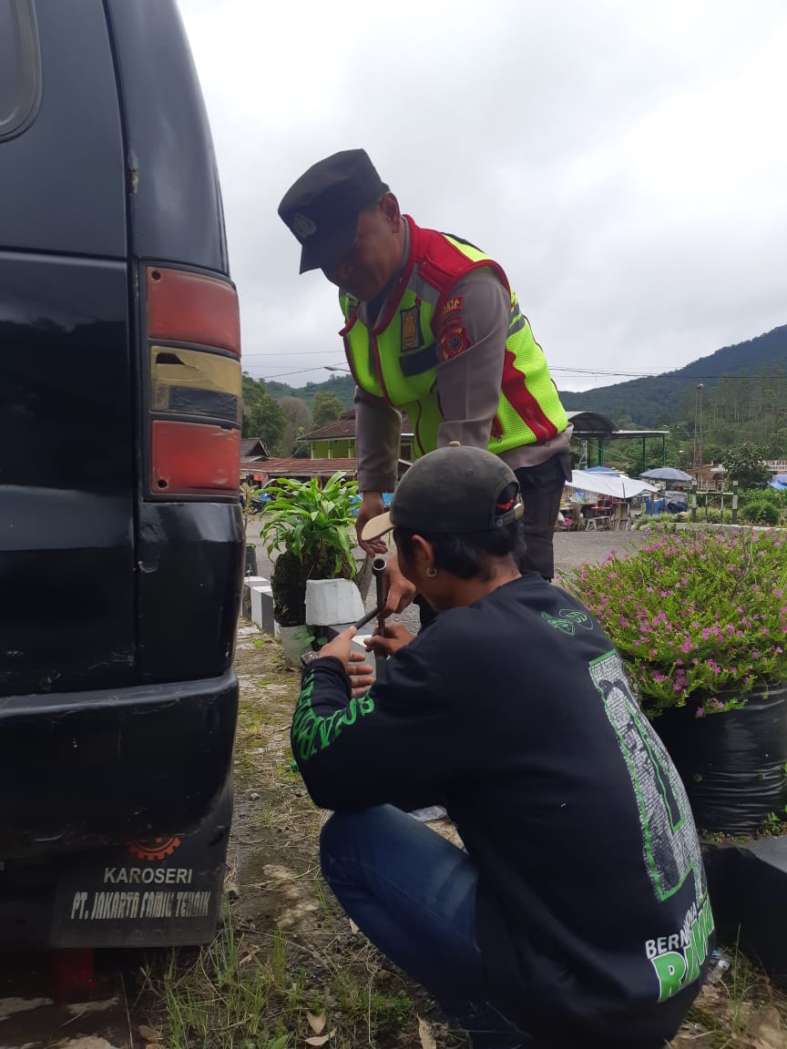 Tanpa ragu, mereka menghampiri kendaraan yang terhenti di pinggir jalan. Dengan kesigapan dan kepedulian, petugas segera membantu memperbaiki ban mobil yang kempes, sehingga perjalanan wisatawan tersebut bisa kembali lancar.