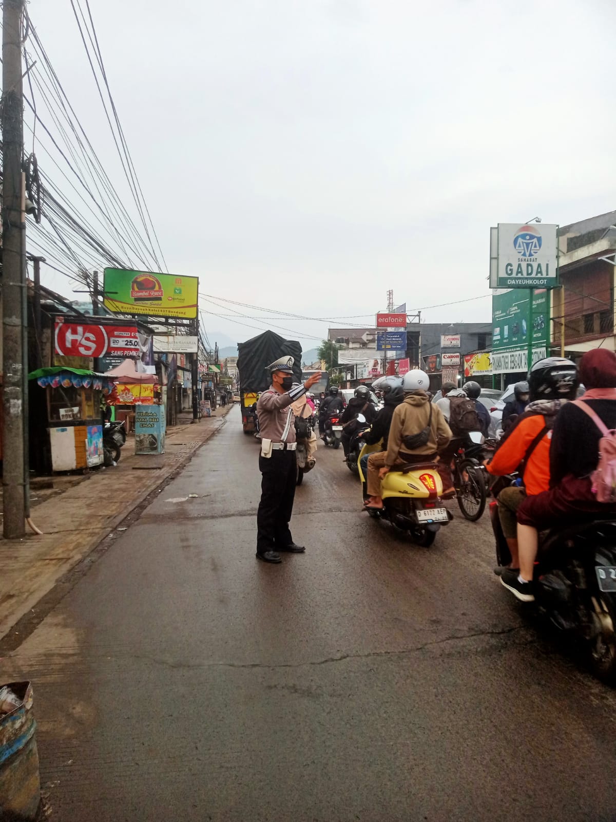 Anggota Polsek Dayeuhkolot Polresta Bandung melaksanakan kegiatan pengaturan arus lalu lintas baik di depan sekolah maupun di simpul – simpul jalan atau di kawasan perdagangan dan tempat tempat penyebrangan karyawan Perusahan.