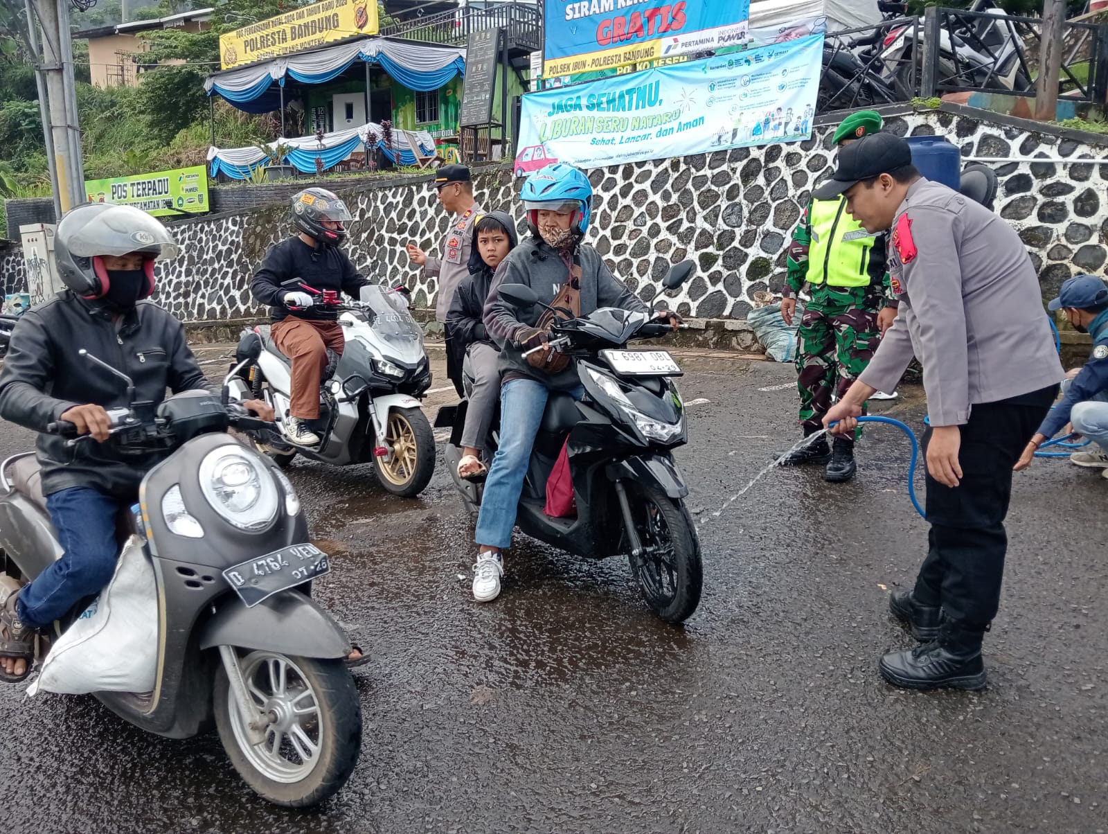 BANDUNG PRAKARSA, Ibun, – Personil Pos Pam Cukang Monteng Kamojang Ibun Iptu Deny Fourtjahjanto S.H bersama jajaran TNI, Polri, Dinas Perhubungan dan Satpol PP melaksanakan gerakan pendinginan pada rem kendaraan roda dua yang akan meneruskan perjalanan ke arah turunan curam Jalan Kamojang-Ibun Kecamatan Ibun Kabupaten Bandung. Rabu (25 Des 2024)