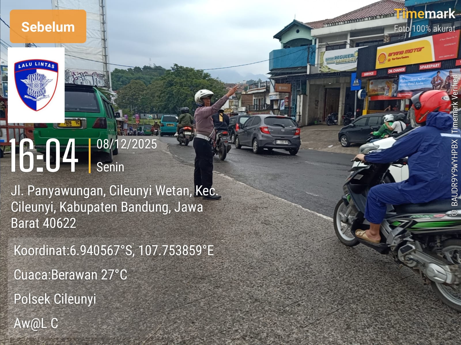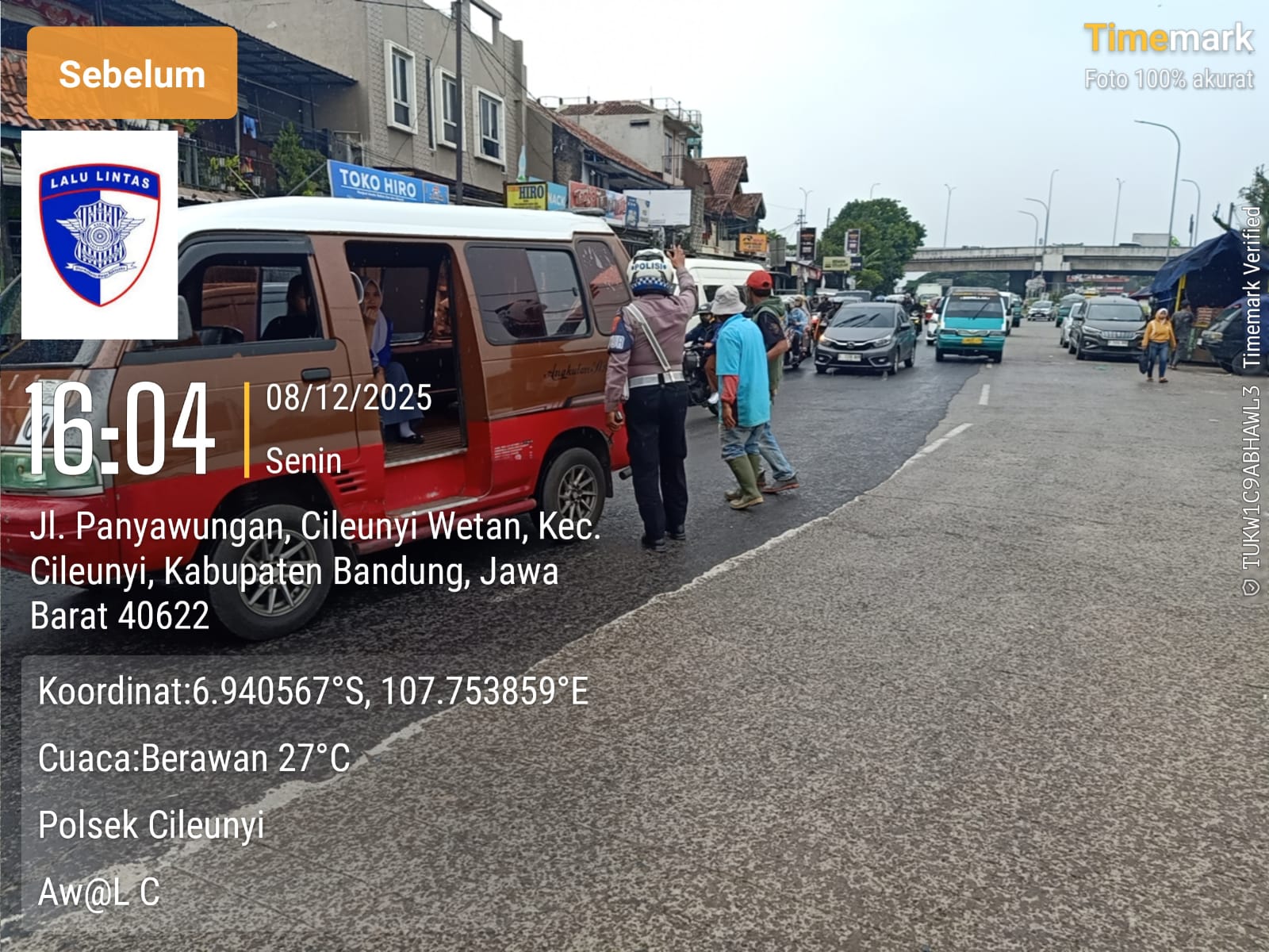 Untuk memastikan lalu lintas tetap berjalan aman dan lancar, Anggota Unit Lalu Lintas Polsek Cileunyi, Polresta Bandung, Aiptu Awal Candra, turun langsung melaksanakan pelayanan masyarakat (Yanmas) sore berupa pengaturan arus kendaraan di depan Pasar Sehat Cileunyi, Senin (8/12/2025) sore