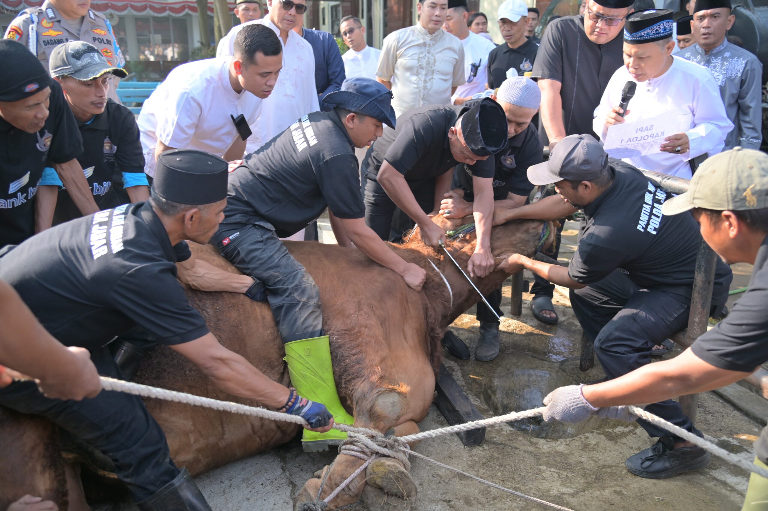 Acara penyembelihan hewan kurban yang dilaksanakan usai pelaksanaan Salat Idul Adha ini merupakan bagian dari tradisi tahunan Polda Jabar dalam memperingati hari besar keagamaan umat Islam. Tahun ini, Ratusan hewan kurban berupa sapi dan kambing disiapkan untuk disembelih dan dibagikan kepada yayasan sosial, pondok pesantren, DKM, tukang ojeg, penyandang cacat, wartawan mitra Polda Jabar hingga masyarakat di sekitar Mapolda Jabar.