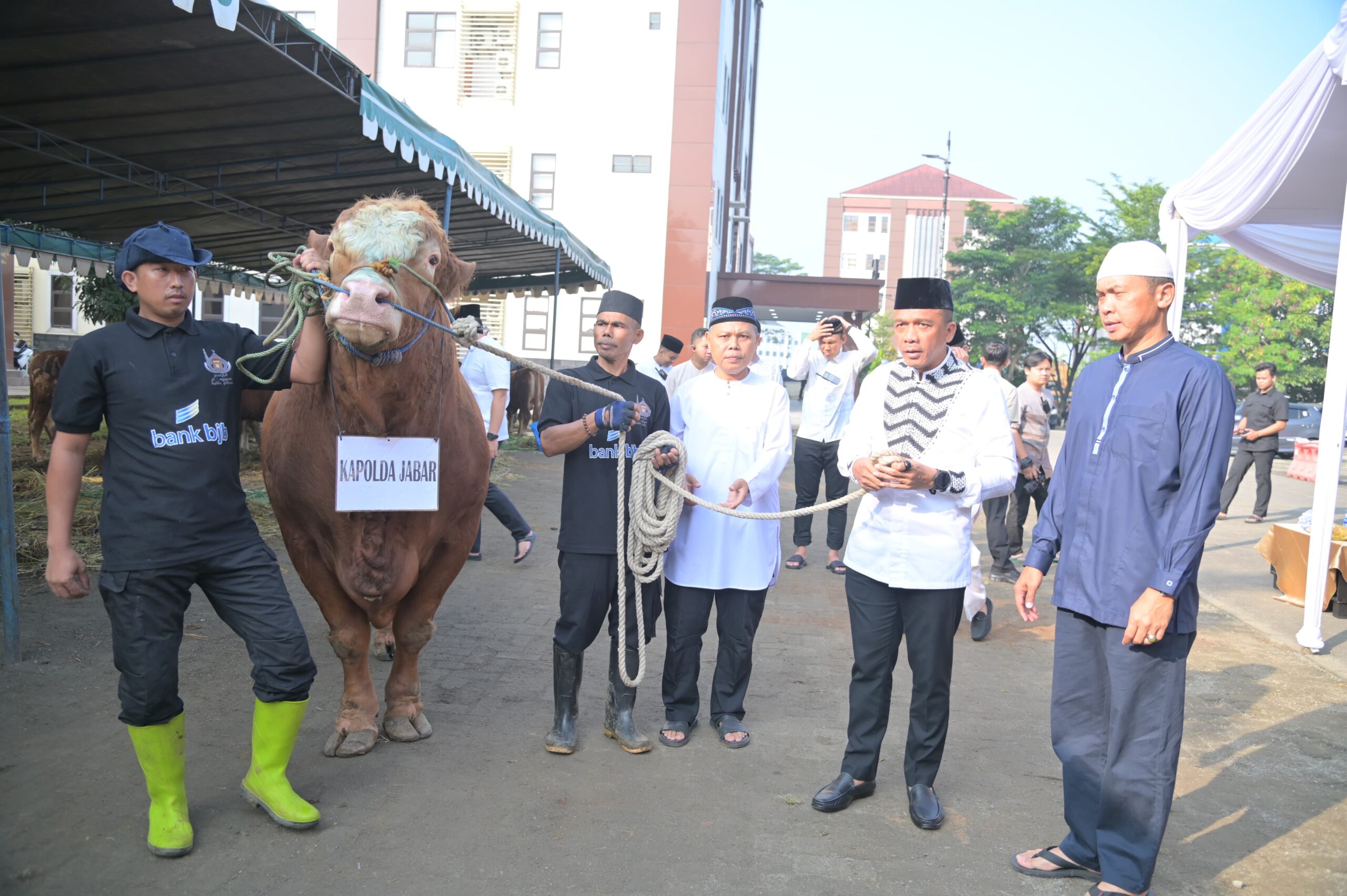 BANDUNG PRAKASA, Dalam rangka memperingati Hari Raya Idul Adha 1446 H Kapolda Jawa Barat Irjen. Pol. Dr. Rudi Setiawan, S.I.K., S.H., M.H. menyerahkan dua ekor sapi limosin sebagai hewan Qurban, Jum’at (6/6/2025).