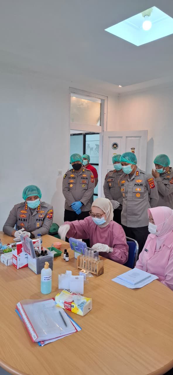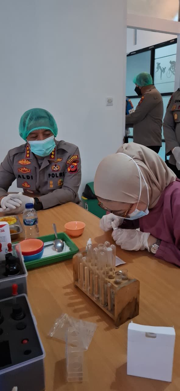 Kapolresta Bandung Kombes Pol Aldi Subartono S.H.,S.I.K.,M.H.,CPHR dan jajaran PJU menyaksikan secara detail tata cara pemeriksaan keamanan pangan atau food safety menggunakan metode cepat, yaitu Rapid Test Kit yang dirancang untuk mendeteksi berbagai zat berbahaya.