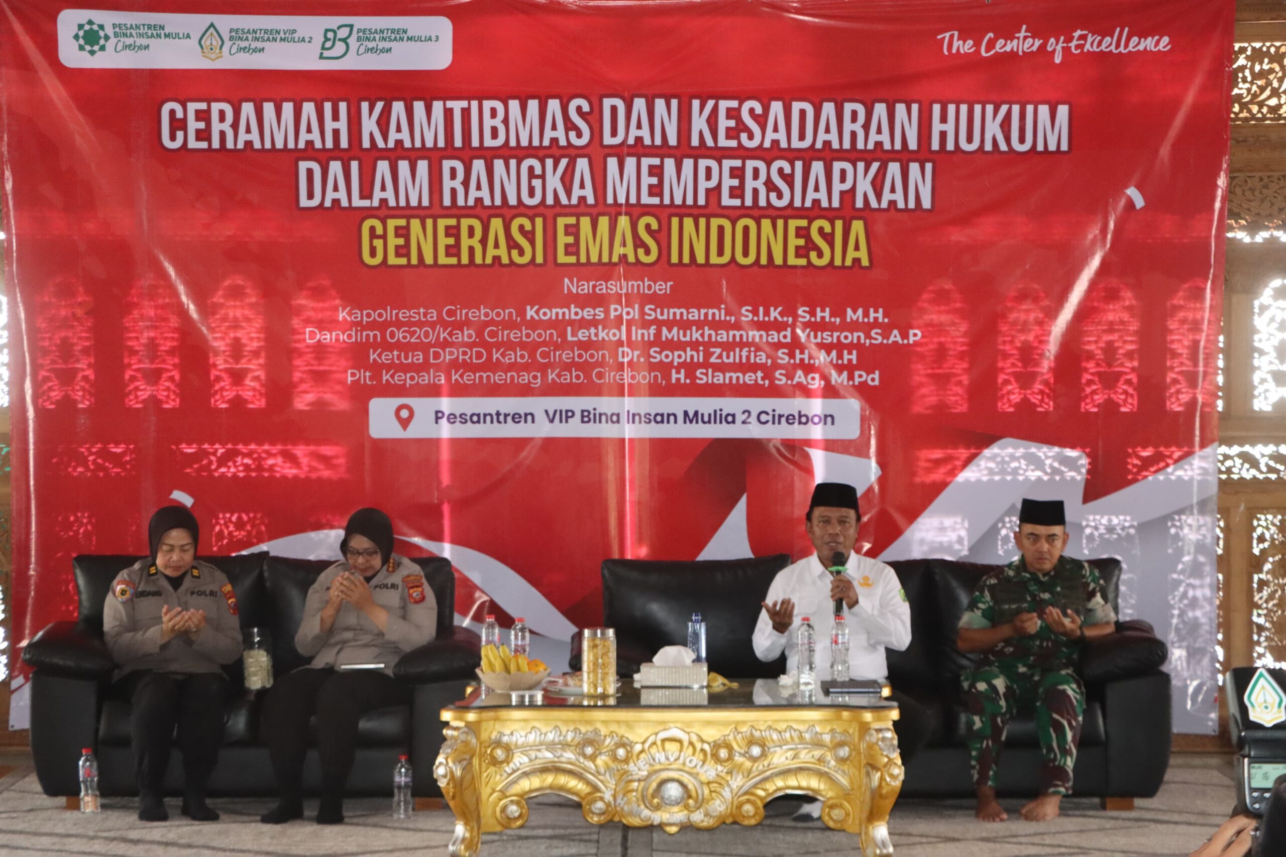 BANDUNGPRAKASA. COM. Kapolresta Cirebon KOMBES POL SUMARNI, S.I.K.,S.H.,M.H, bersama Dandim 0620/Kab. Cirebon LETKOL Inf. MUKHAMAD YUSRON dan Plt. Kepala Kemenag Kab. Cirebon H. SELAMET, memberikan Ceramah Kamtibmas dan Kesadaran Hukum Dalam Rangka Mempersiapkan Generasi Emas Indonesia di Pesantren Bina Insan Mulia Kecamatan Dukupuntang Kabupaten Cirebon, Selasa (30/9/2025).