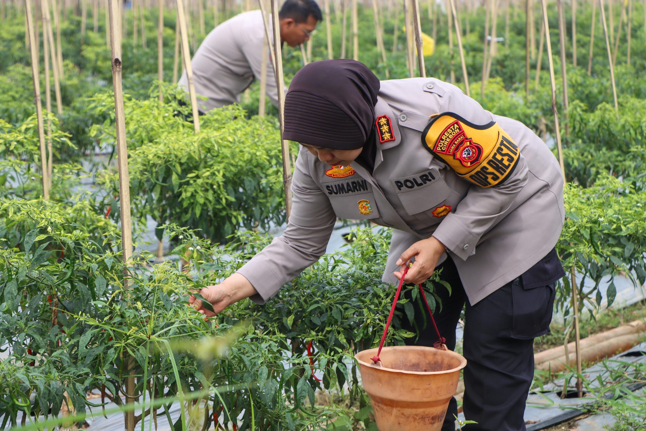 BANDUNG PRAKARSA, Kapolresta Cirebon, Kombes Pol Sumarni, S.I.K, S.H, M.H, bersama jajaran PJU Polresta Cirebon melaksanakan Panen Cabai dan Pengecekan Lahan Dalam Rangka Program Ketahanan Pangan di Dusun Karoya Desa Tanjung Anom Kecamatan Pasaleman Kabupaten Cirebon, Kamis (2/1/2025).