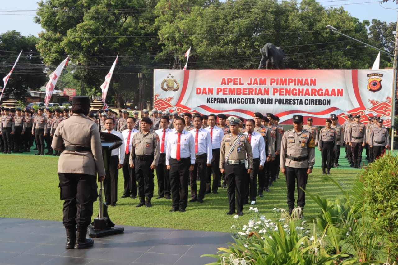 BANDUNGPRAKASA. COM. Kapolresta Cirebon KOMBES POL. SUMARNI, S.I.K., S.H., M.H., memimpin Apel Jam Pimpinan dan memberikan Penghargaan Kepada Anggota Polri Polresta Cirebon Yang Berprestasi, Senin (11/8/2025). Kegiatan bertempat di Mako Polresta Cirebon.