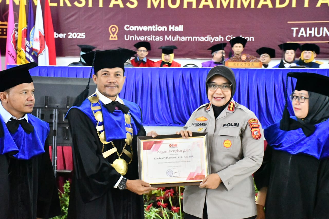 BANDUNGPRAKASA. COM. Kapolresta Cirebon KOMBES POL. SUMARNI, S.I.K., S.H., M.H, menerima Penghargaan TOKOH TELADAN PEDULI GENERASI MUDA dalam Wisuda ke-33 Universitas Muhammadiyah Cirebon Tahun Akademik 2024–2025 di Convention Hall Universitas Muhammadiyah Cirebon Jl. Fatahillah Kel. Watubelah Kec. Sumber Kab. Cirebon, Sabtu (25/10/2025).