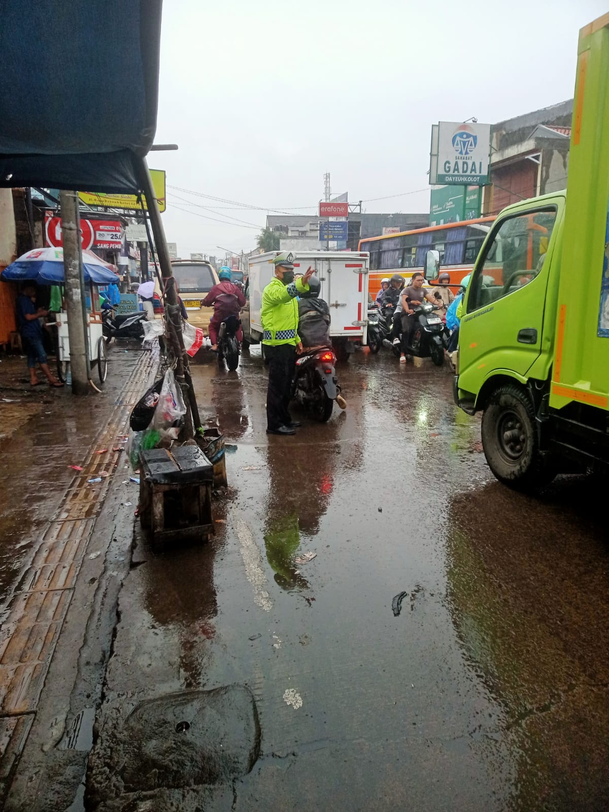 Cuaca hujan tidak membuat personil unit lantas Polsek Dayeuhkolot Polresta Bandung tak surut dalam melaksanakan strong point melaksanakan Pengaturan lalu lintas.