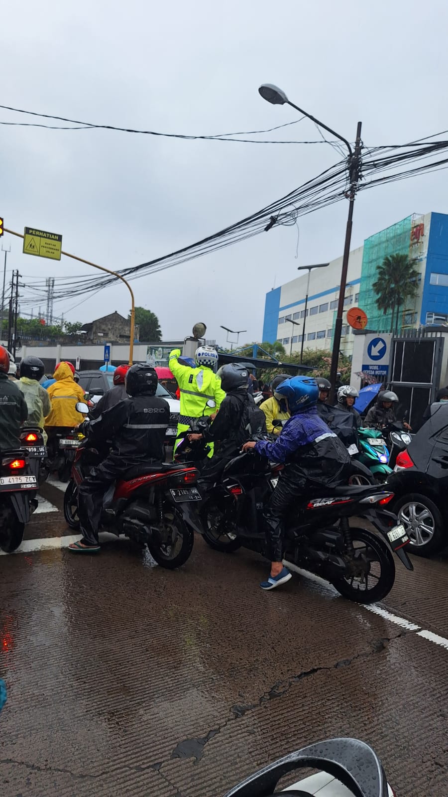 Pengaturan lalulintas pagi menjadi prioritas utama, dan hujan bukanlah penghalang bagi anggota Polri yang selalu siaga dalam melaksanakan tugasnya.