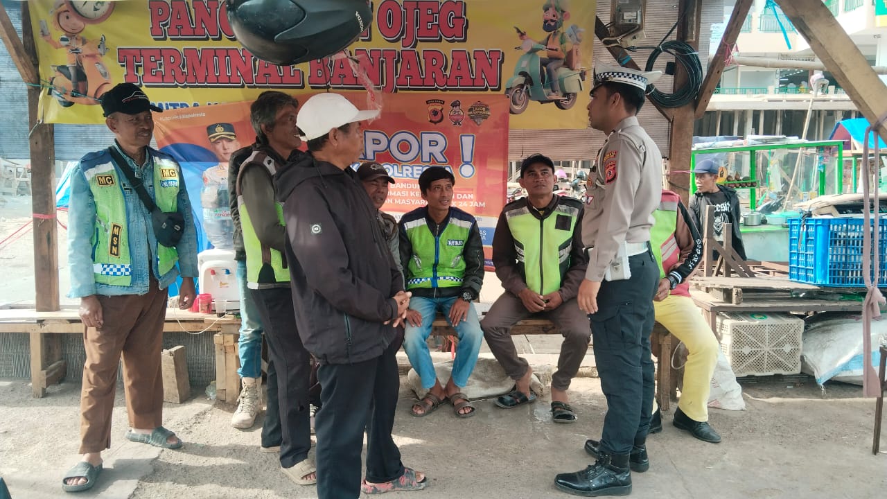 BANDUNG PRAKARSA, Banjaran-Dalam upaya peningkatan kesadaran masyarakat tentang aturan lalu lintas dalam berkendara, Panit Lantas Polsek Banjaran Polresta Bandung Ipda Yuheru Bersama Anggota Bripka Budiman menggelar kegiatan sosialisasi OPS keselamatan lodaya 2025, Sosialisasi dilakukan secara langsung kepada pengemudi ojek pangkalan di terminal Banjaran Desa Banjaran kulon Kecamatan Banjaran, Kabupaten Bandung,rabu (12/02/25)