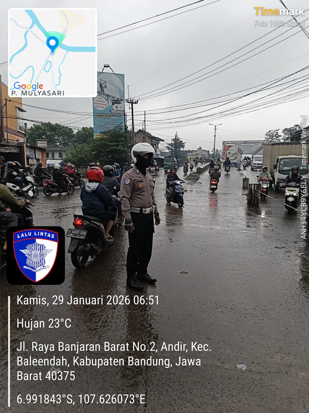 BANDUNGPRAKASA.COM.Baleendah – (29/01/2026) Pasca turunnya hujan yang menyebabkan peningkatan kepadatan arus kendaraan di pertigaan Andir.Unit Lantas Polsek Baleendah melaksanakan pelayanan pengaturan lalu lintas.