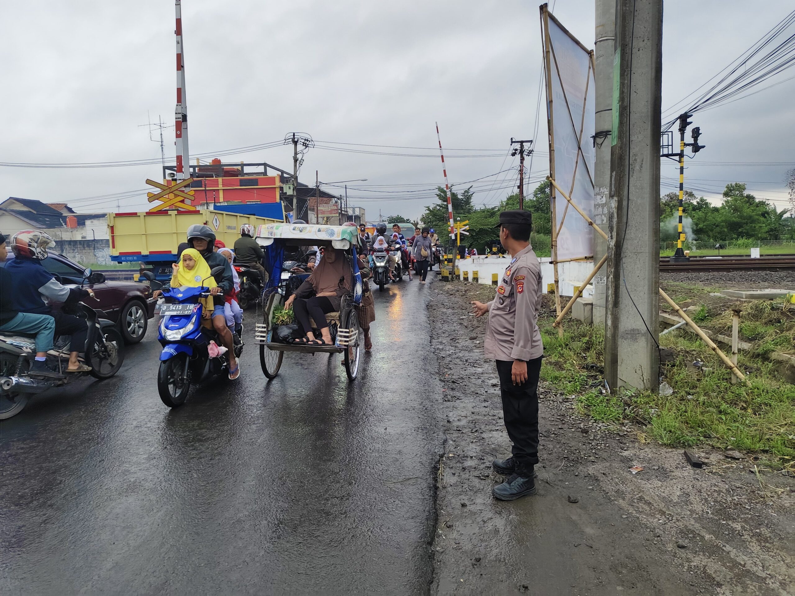 Pastikan lalulintas lancar, Unit Samapta Polsek Rancaekek laksanakan pengaturan lalu lintas di perlintasan Kereta Api Rancaekek