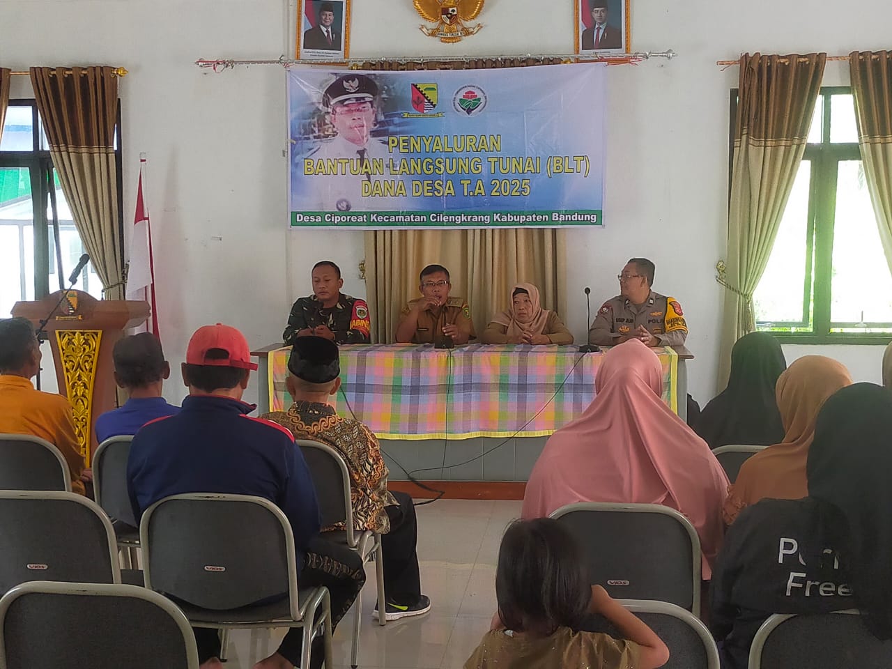 BANDUNGPRAKASA. COM. Cileunyi – Dalam upaya memastikan penyaluran bantuan sosial berjalan lancar dan tepat sasaran, Bhabinkamtibmas Desa Ciporeat Polsek Cileunyi, Polresta Bandung, Aiptu Usep Jeni, S.Sos, bersama Babinsa setempat melaksanakan pendampingan kegiatan penyaluran Bantuan Langsung Tunai (BLT) Dana Desa tahap II yang berlangsung di Aula Kantor Desa Ciporeat, Kecamatan Cilengkrang, Kabupaten Bandung, Senin (3/11/2025).