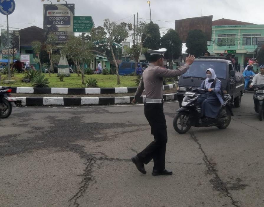 BANDUNG PRAKARSA, PANGALENGAN – Personil unit lantas Polsek Pangalengan Polresta Bandung Polda Jawa Barat laksanakan pelayanan pengaturan lalu lintas pada pagi hari guna jamin kelancaran arus dan keselamatan pengguna jalan.