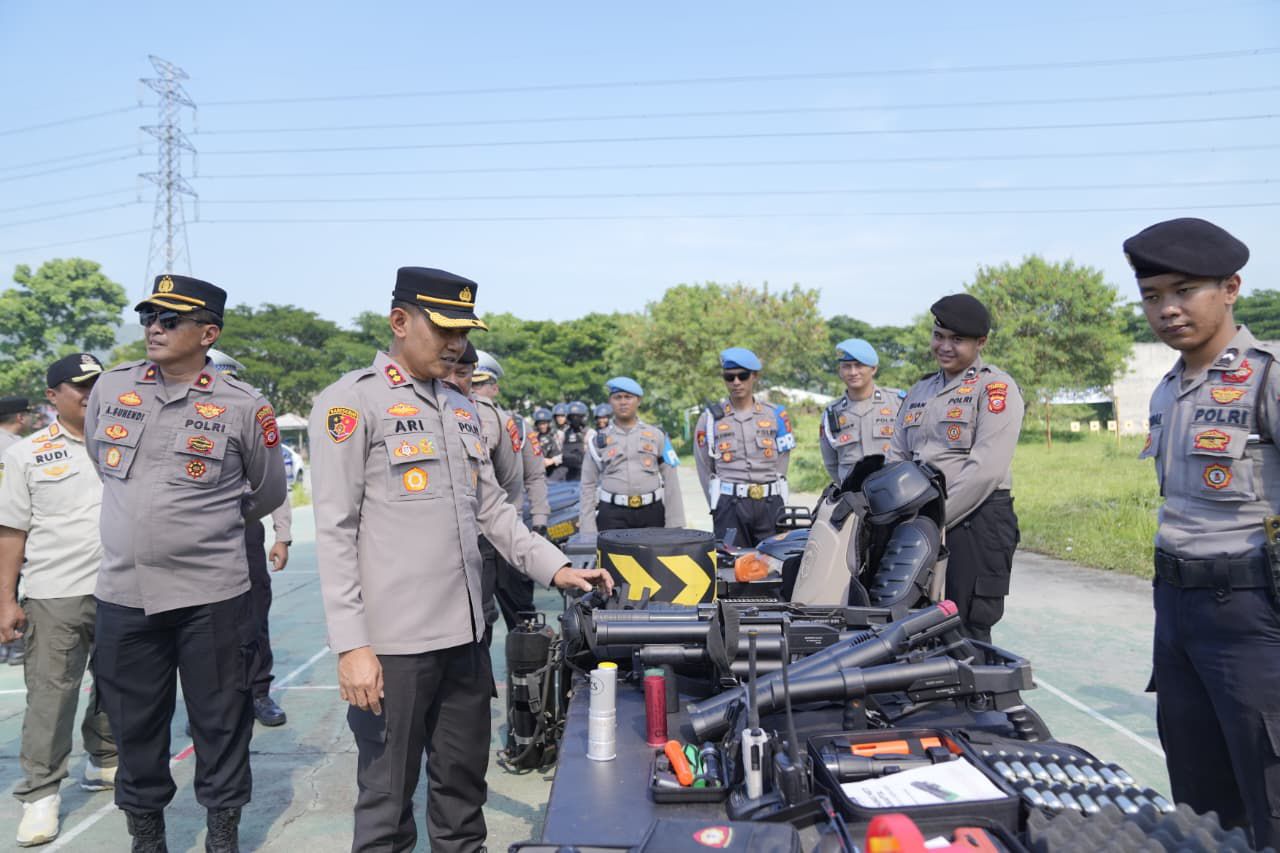 Adapun rangkaian kegiatan meliputi pengecekan kendaraan dinas (AWC, kendaraan patroli, wal lantas, inafis), perlengkapan perlindungan perorangan (rompi set, tameng, tongkat), hingga alat pendukung lainnya seperti APAR, senjata gas air mata, body cam, alat komunikasi, senjata, dan peluru karet.