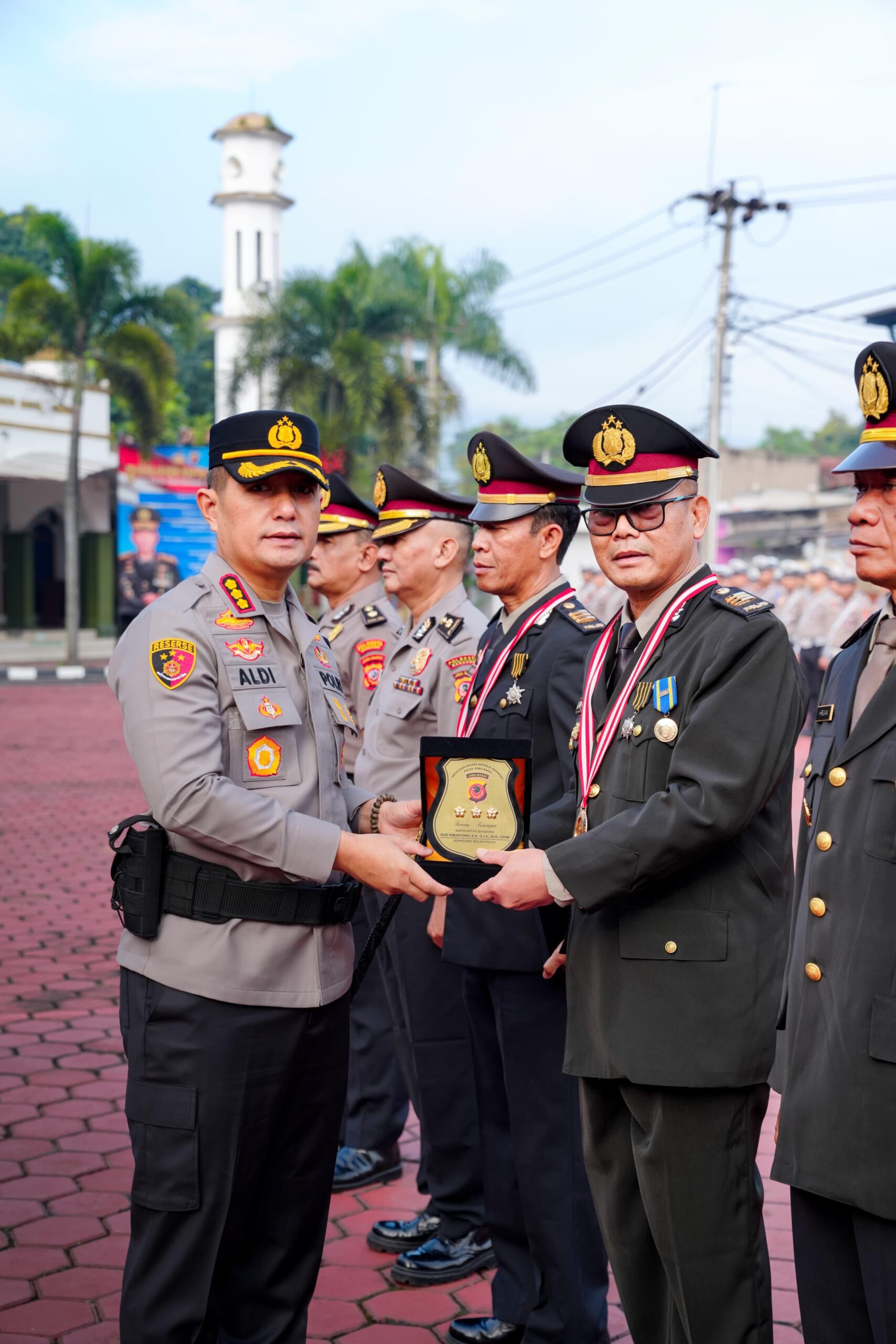 Dalam kesempatan tersebut, dua personel Polresta Bandung menerima kenaikan pangkat pengabdian, yakni Kompol Asep Muharam, S.H., selaku Kasikum Polresta Bandung, dan Kompol Dedi Supriadi, S.H., Kasubbag Kerma Bagops Polresta Bandung.