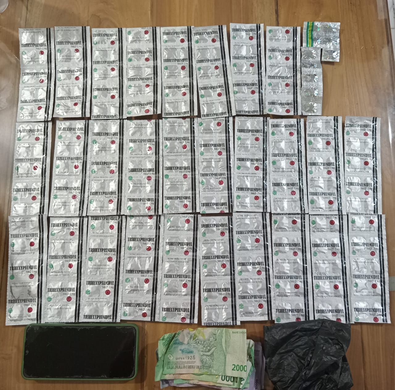 Saat dilakukan penggeledahan di rumah S, petugas menemukan sejumlah barang bukti berupa 180 butir Trihexyphenidyl, 10 butir Tramadol, serta uang tunai sebesar Rp112.000.