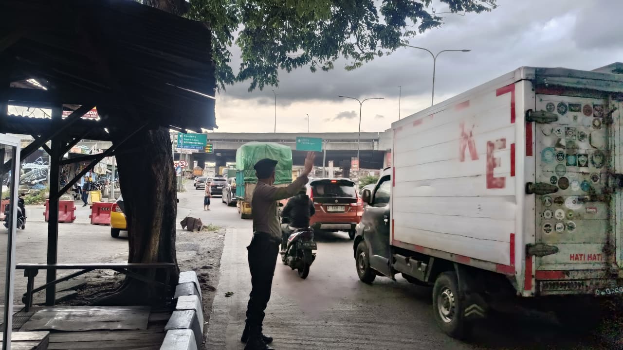 Dengan gerakan tangan yang tegas namun tetap humanis, ia mengarahkan pengendara roda dua maupun roda empat untuk bergantian melintas sehingga arus kendaraan tetap mengalir lancar.
