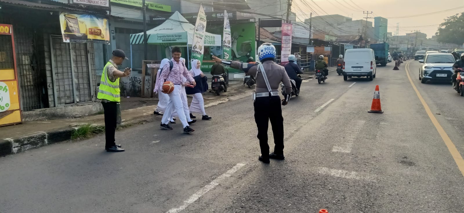Melihat kondisi tersebut, Aiptu Awal Candra sigap mengatur arus lalu lintas sekaligus membantu para siswa menyeberang dengan aman. Kehadiran petugas di titik tersebut dinilai sangat membantu dalam menciptakan rasa aman, baik bagi siswa maupun pengguna jalan lainnya.