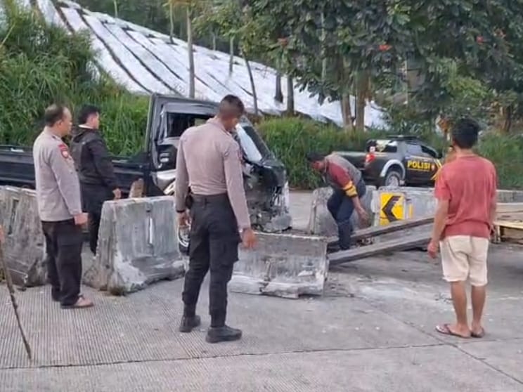 Menurut saksi di tempat kejadian kecelakaan lalu-lintas tersebut terjadi diduga Sopir yang membawa mobil Pikup melaju dari arah garut menuju Bandung mengantuj, Karena tidak bisa mengendalikan laju Mobilnya akhirnya Menabrak beton pembatas jalan.