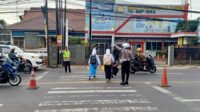Minimalisir Kecelakaan, Anggota Unit Lantas Polsek Cileunyi sebrangkan pejalan kaki di sekitar Sekolah Mekar Arum Cinunuk