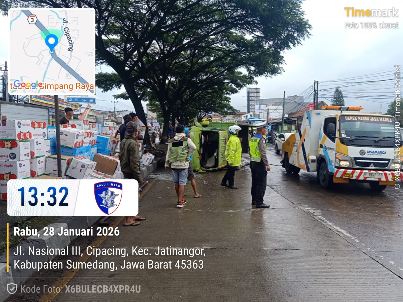 Truk Bermuatan Buah Terguling di Jalan Raya Cipacing–Cileunyi, Polsek Cileunyi Sigap Atur Lalu Lintas