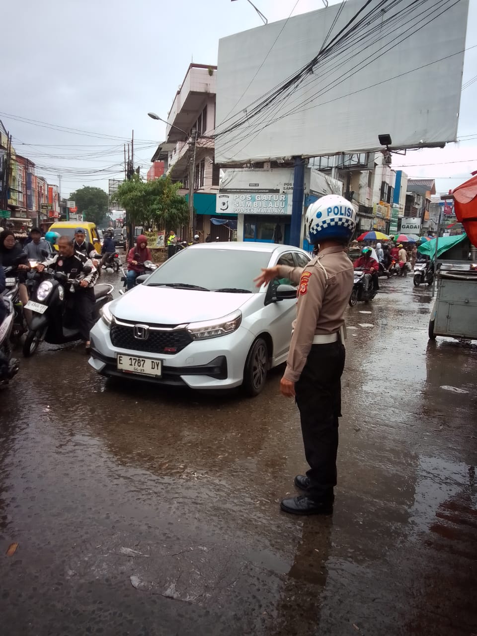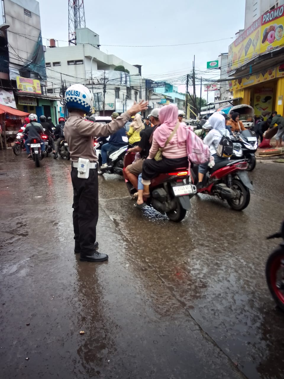Petugas tampak membantu masyarakat menyeberang jalan, mengurai kemacetan, serta memberikan imbauan kepada pengguna jalan agar tertib dan mengutamakan keselamatan, ujar kapolsek