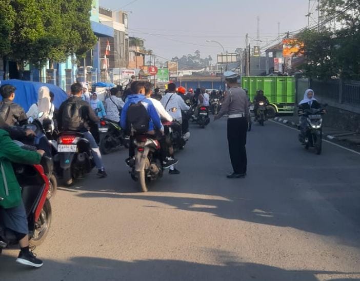 BANDUNG PRAKARSA, PANGALENGAN – Personil unit lantas Polsek Pangalengan Polresta Bandung Polda Jawa Barat laksanakan pelayanan pengaturan lalu lintas pada pagi hari guna jamin kelancaran arus dan keselamatan pengguna jalan.