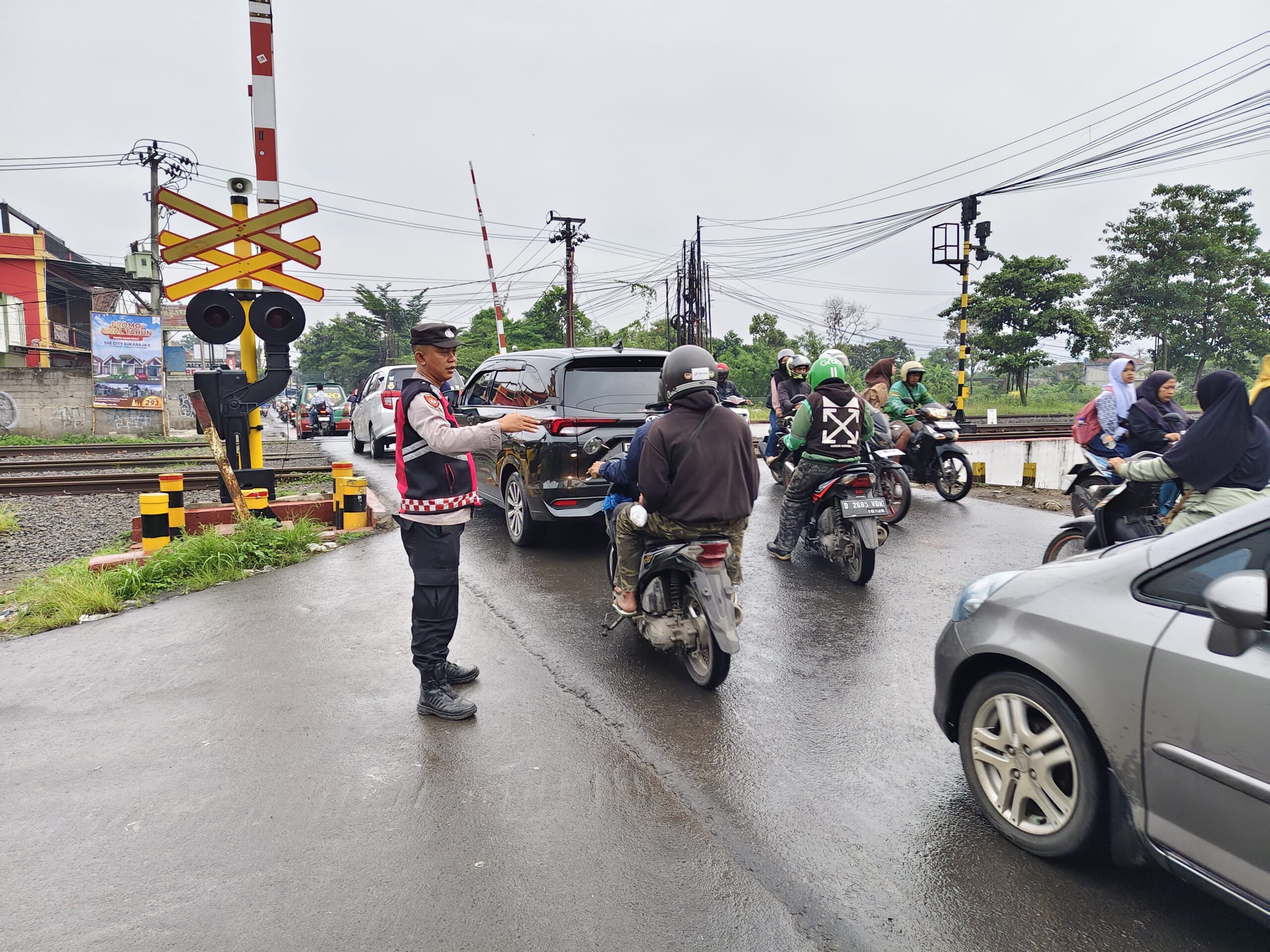 BANDUNG PRAKARSA, Rancaekek, Personil Unit Samapta Polsek Rancaekek Polresta Bandung pelayanan pagi urai kepadatan lalu lintas di sekitar Pintu Pelintasan Kereta Api. Kamis 23/01/2025